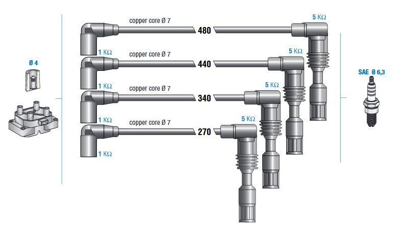 Sada obsahuje 5 káblov o dlžke 570, 470, 370, 320 a 600 cm