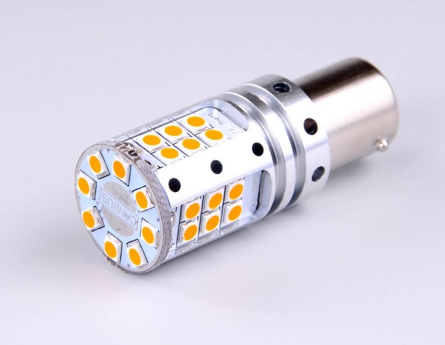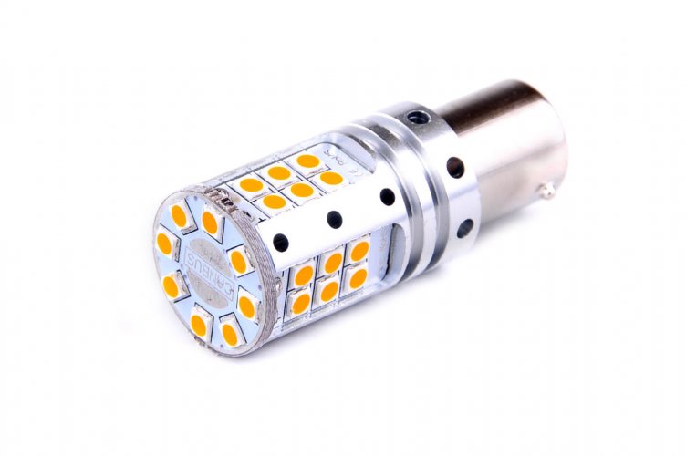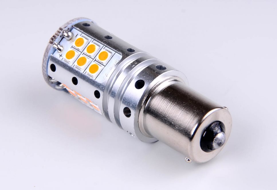 LED náhrada žárovky PY21W s velmi vysokým příkonem. Při výměně za klasickou žárovku se příliš nezvýší frekvence blikání.