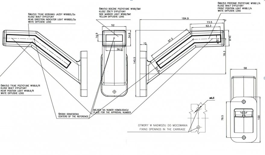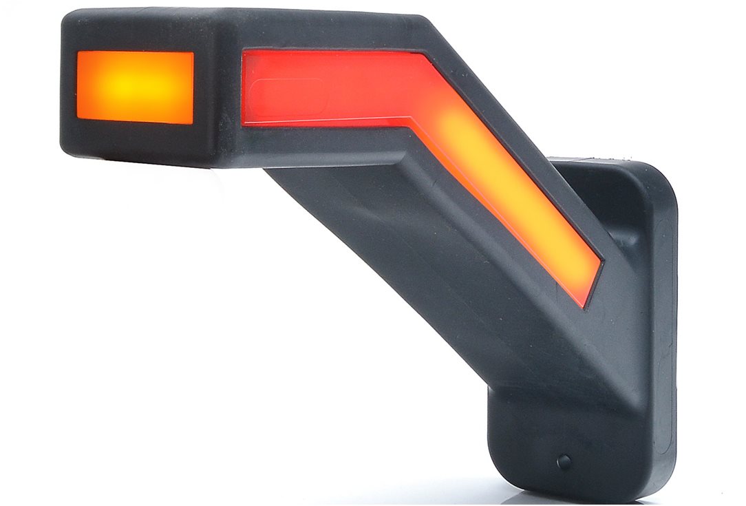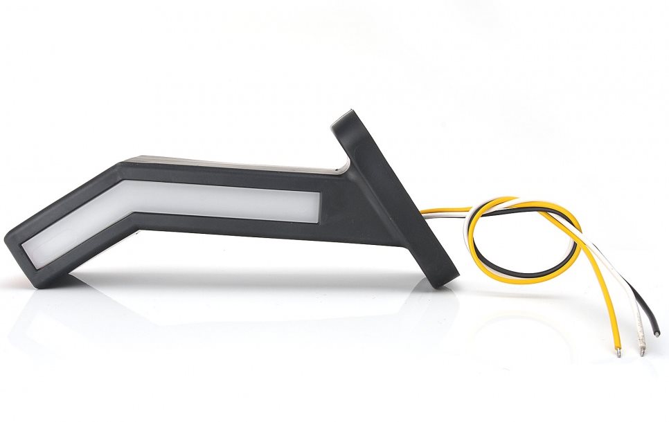 Boční poziční světlo "tykadlo" se čtyřmi funkcemi: přední obrysové sv. čiré (9led) , boční obrysové sv. oranžové (3led) , zadní obrysové s. červené + dynamický blinkr (9led)