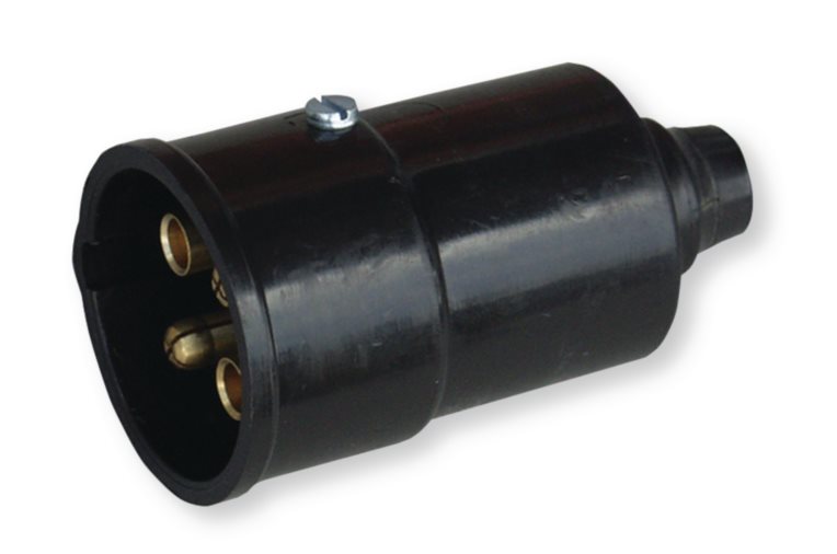 Zástrčka plastová 6V-12V-24V/ 4póly -skrutkové spoje, nárazuvzdorný plast,dľžkovo delená, so zaisťovacou klapkou a gumeným tesnení.