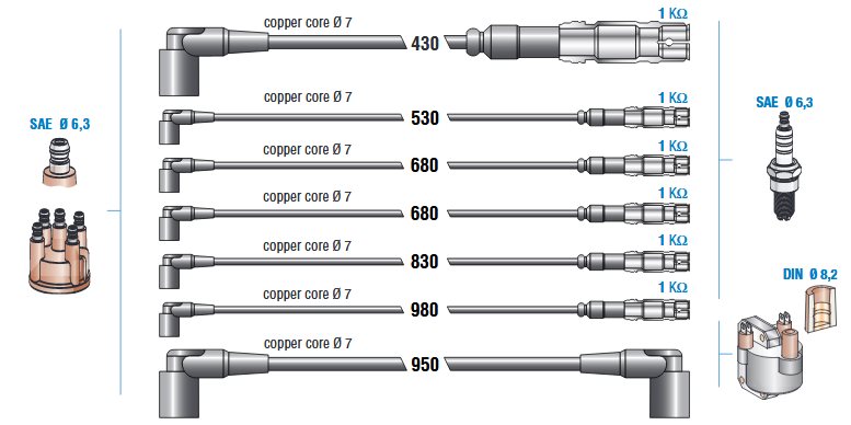Sada obsahuje 7 káblov o dlžke 430cm, 530cm, 2ks 680cm,830cm, 980cm a 950cm
