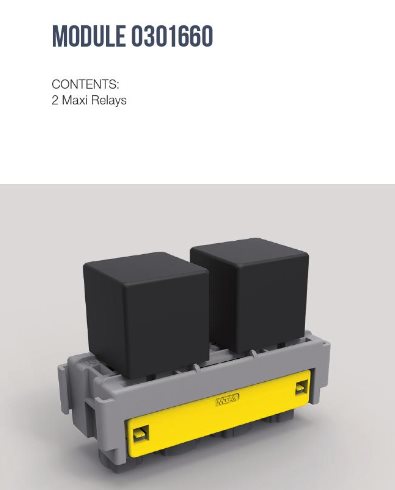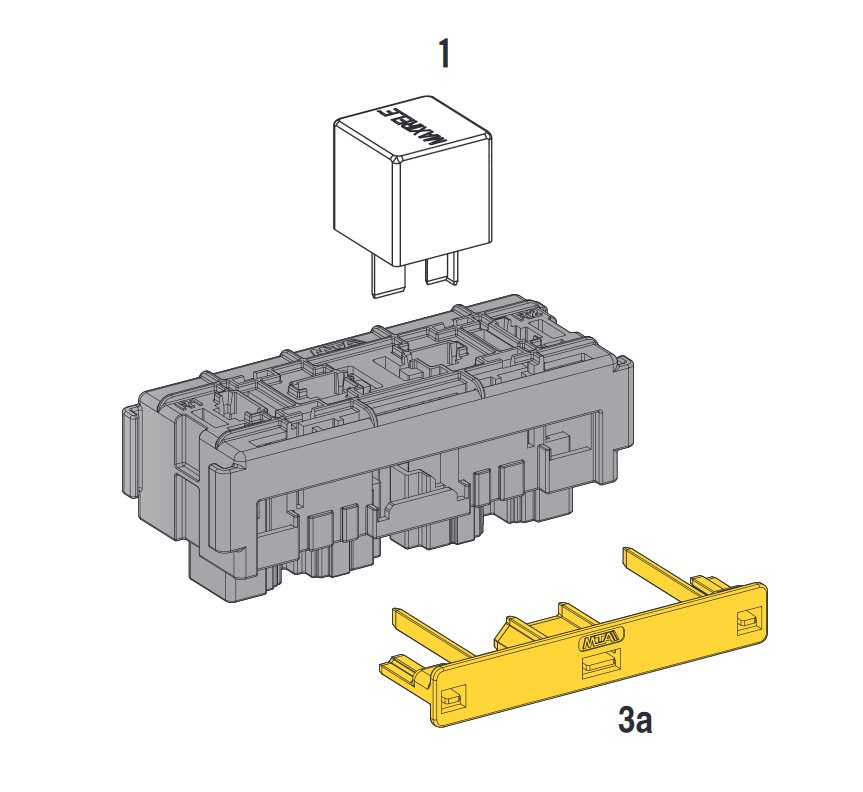 Vhodné pre relé t.j. 944518REC3, A5010 a iné. Možné doobjednať konektory pod označením SPT F950 (11.07741) -4ks a f630E(11.08501) - 4 ks, kryt pod č.01.01590 , upevňovacie konzoly č.01.01580 .