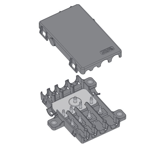 Držiak vhodný pre 4x MIDI poistky, alebo 4x na plieškovú poistku so zbernicou + krytka
