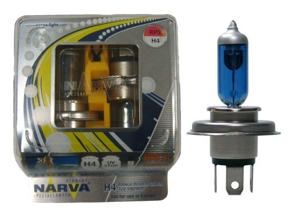 Halogénová autožiarovka H4 Narva Range Power Silver s modrobielym denným svetlom (teplota svetla 4100 Kelvina) a s väčším svetelným tokom až o 50 % vo vzdialenosti 75 metrov pred vozidlom.