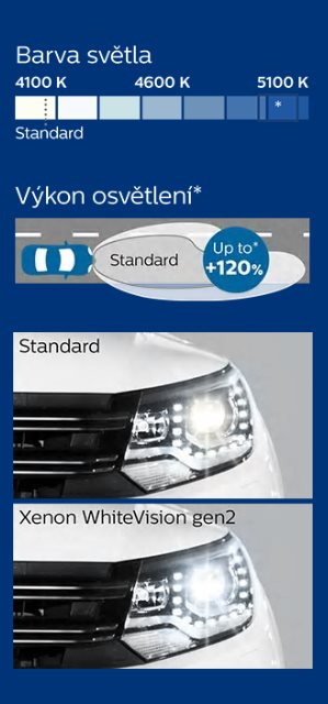 Naše nové žiarovky Philips Xenon White Vision Gen2 dávajú vášmu vozidlu intenzívny biely vzhľad a zlepšujú vašu viditeľnosť na ceste vďaka bielemu svetlu s teplotou chromatičnosti až 5100K.