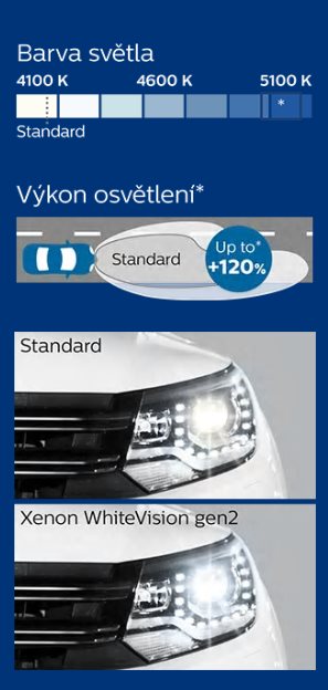 Žiarovka výbojka Philips Xenon WhiteVision 2. generácia dodávajú vášmu autu intenzívny biely vzhľad a ožiaria cestu jasnejším a rovnomernejším bielym svetlom. Ideálna voľba pre xenónové svetlomety, ktoré doplňujú LED svetla.