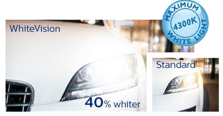 Žiarovky WhiteVision dajú Vášmu autu biely xenónový efekt, ktorý oceníte hlavne v noci. Zvýšený jas o 40% robí z WhiteVision perfektnú kombináciu štýlu a bezpečnosti.
