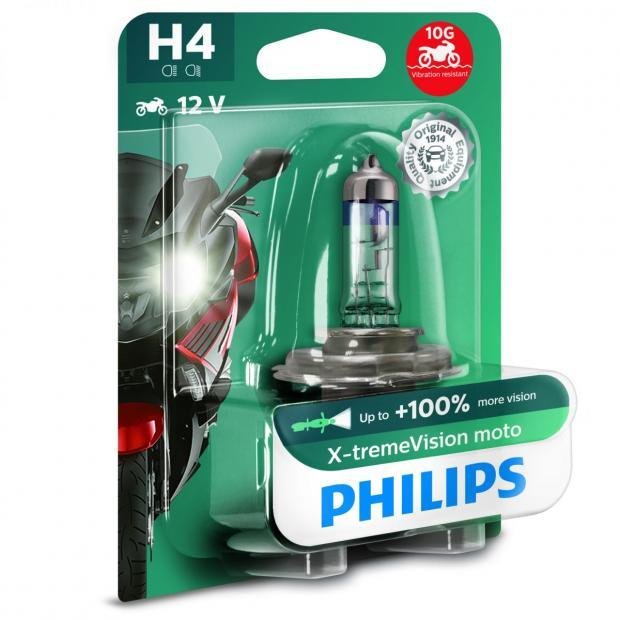 Žiarovka s vysokým svetelným tokom pre motocykle. Odolnosť proti otrasomm až 10G!!! Pri bežnej watáži poskytuje až o 130% väčšiu svietivosť ako klasická žiarovka ( 75m pred motocyklom). Vyšší výkon žiarovky je dosiahnutý špeciálnou zmesou plynov a presnou konštrukciou vlákna. Špička žiarovky je pochromovaná s modrými prúžkami. Žiarovky Philips X-treme Vision Moto majú homologizáciu do verejnej premávky a slúžia ako plnohodnotná náhrada klasických žiaroviek v svetlometoch.