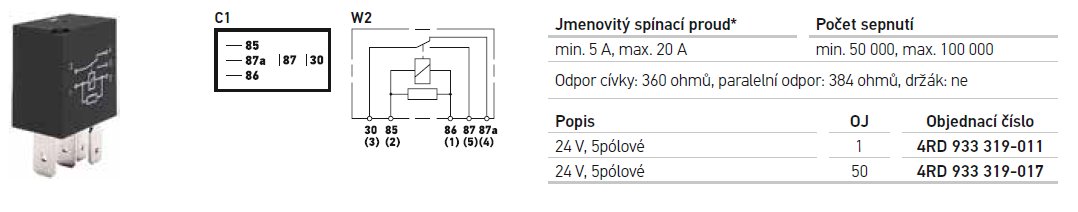 Relé 24V - MICRO 10A/20A - 5 kontakt s odporom