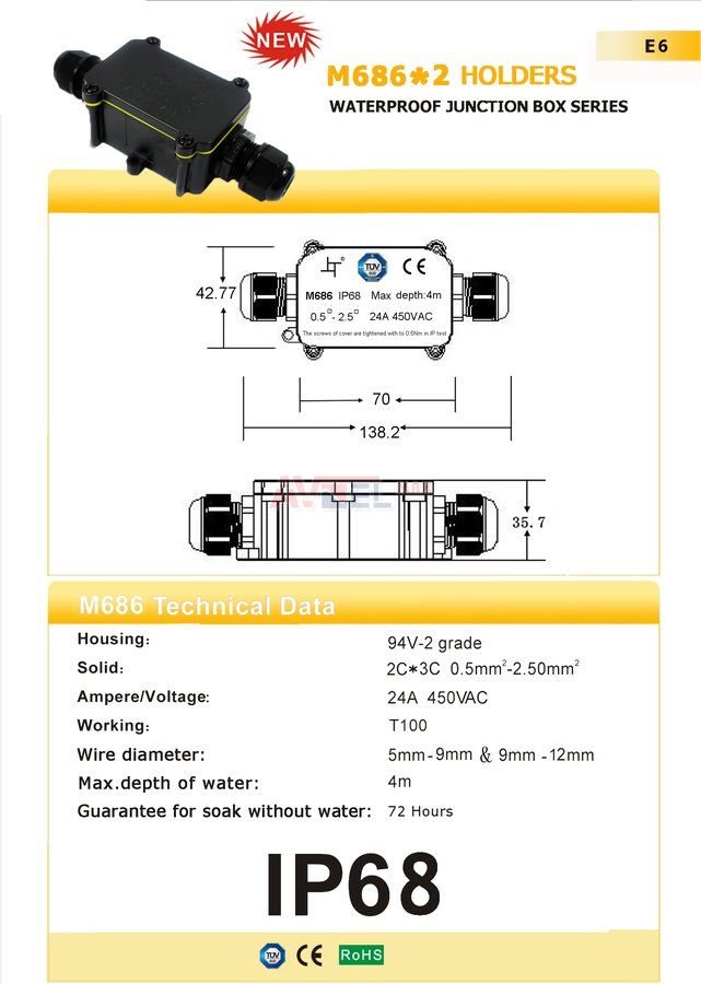 Vodotesná rozbočovacia inštalačná krabička pre elektrorozvody (prepojovacia krabička / káblová spojka)